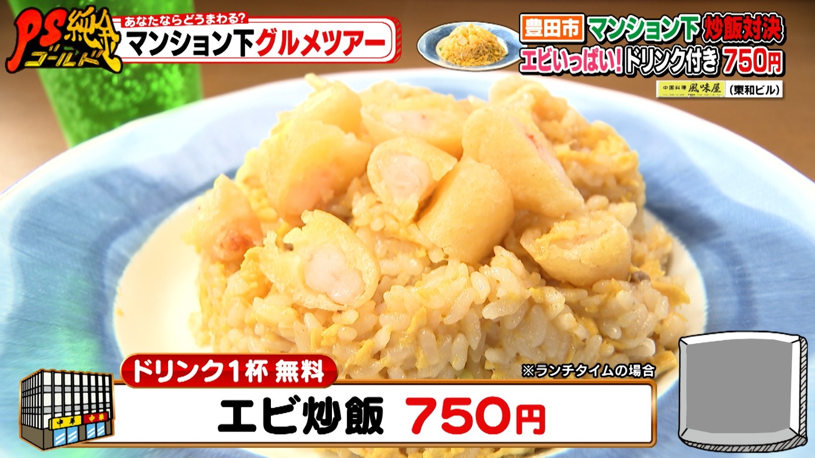 『風味屋』のおすすめチャーハンは「エビ炒飯(750円、ランチタイムはドリンク一杯無料)」。一度揚げたプリプリのエビがたっぷりと乗ったチャーハンに、内山さんは「ウマ山!」と感激します。