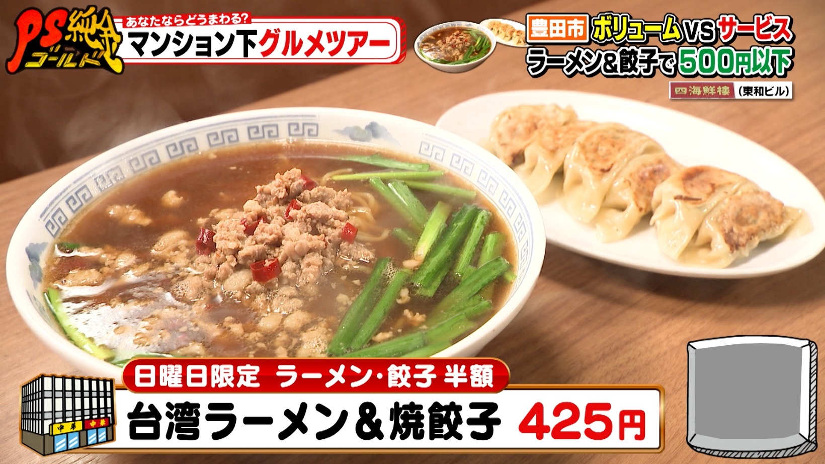 中華対決延長戦!再び『四海鮮樓』に戻ってきた内山さんは「台湾ラーメン&焼餃子」を注文します。こだわりの自家製しょうゆのラーメンと、餡がぎっしりと詰まった餃子のセットは、日曜日限定で425円と激安!
