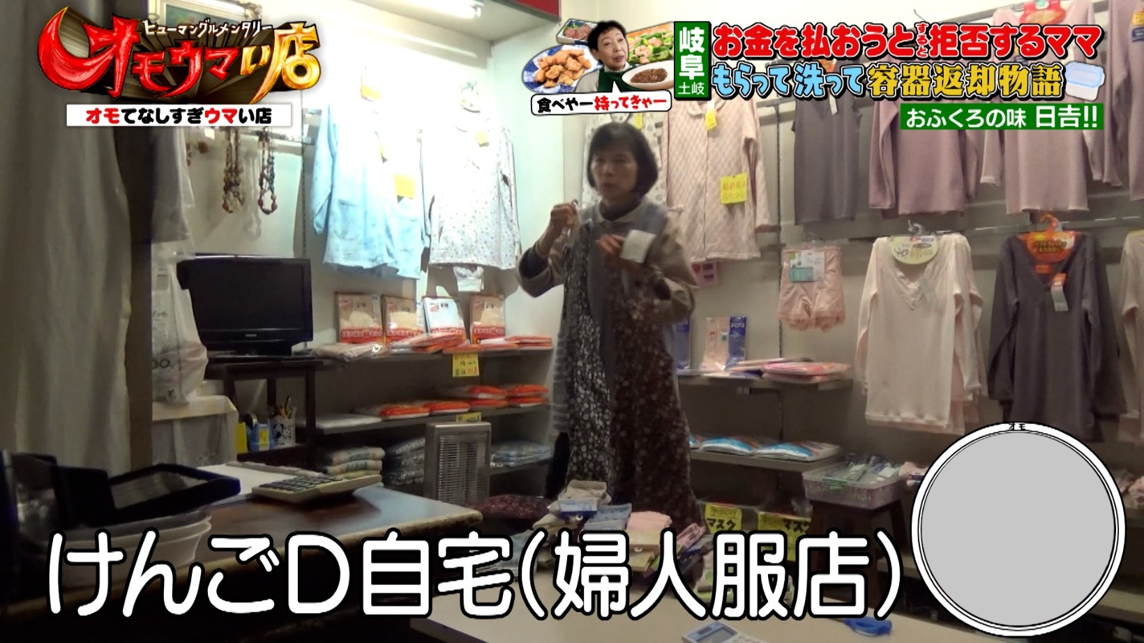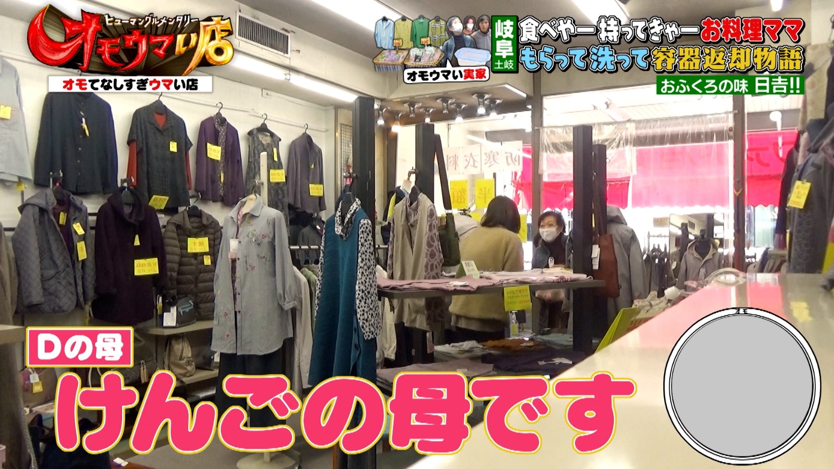 今回取材した『おふくろの味 日吉!!』とけんごDの実家は、電車で10分ほどの距離。ある日、けんごDの実家が営む婦人服店に店主が訪れてくれました。けんごDのお母さんをはじめ、おばあちゃんやお父さんが出迎える様子に、スタジオから「家族総出!」と笑いが起こるのでした。