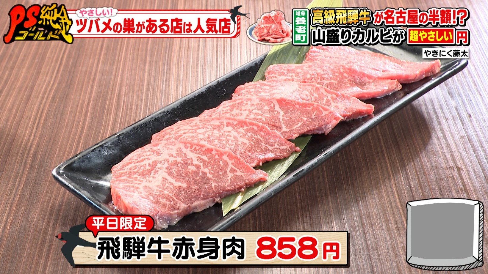 平日限定の「飛騨牛赤身肉(858円)」を食べた高岸さんは、「ホームラン!!」と味やコストパフォーマンスを絶賛します。