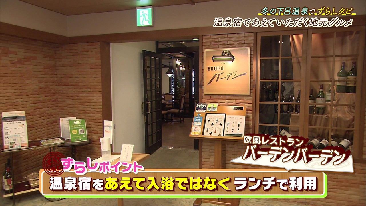 あえて温泉には入らず、館内のレストラン『バーデンバーデン』で地元素材を使ったグルメを満喫するのが「ずらしタビ」のポイント。
