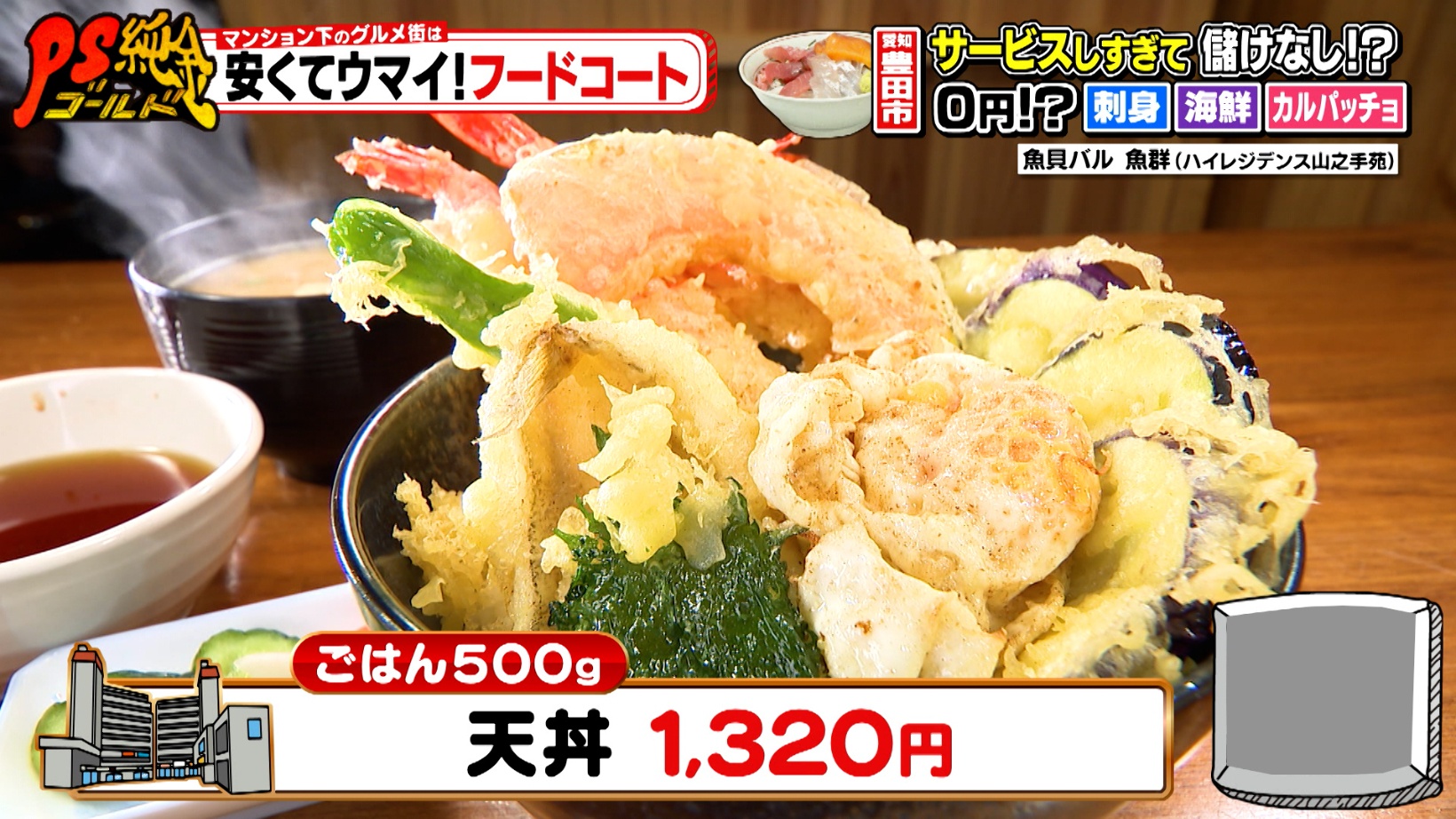 さらに、ごはん500gの上にエビ4尾、キス、ナス、カボチャなど計8種類13個の具材がのった「天丼(1,320円)」はコスパ最強です。豪快な見た目の天丼に、スタジオメンバーは大興奮の様子なのでした。