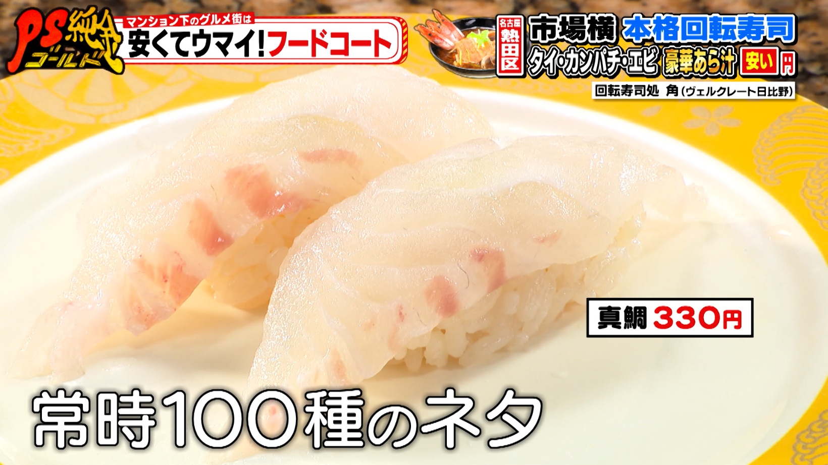 こちらの店は「真鯛(330円)」や「焼きあなご一本握り(528円)」、「こはだ(330円)」など、常時およそ100種のネタがそろっています。隣に市場があることから、新鮮なネタを提供できるのだとか。