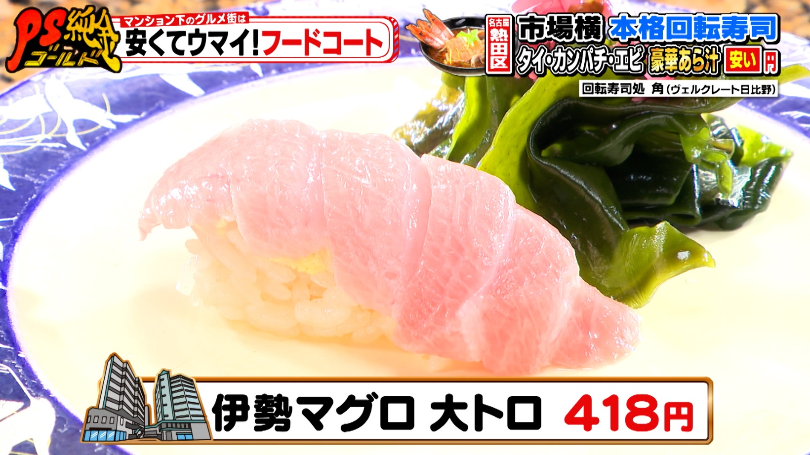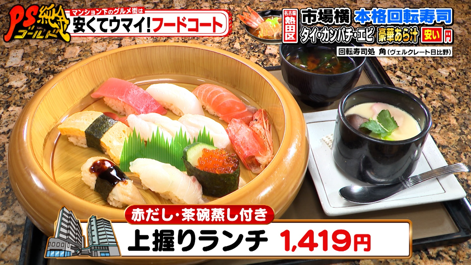 地下鉄名港線日比野駅直結の『ヴェルクレート日比野』の1階にある回転寿司店『寿司処 角』。高田さんと藤森さん、ゲストの高橋英樹さんがスタジオを飛び出して、現地でグルメを堪能します。