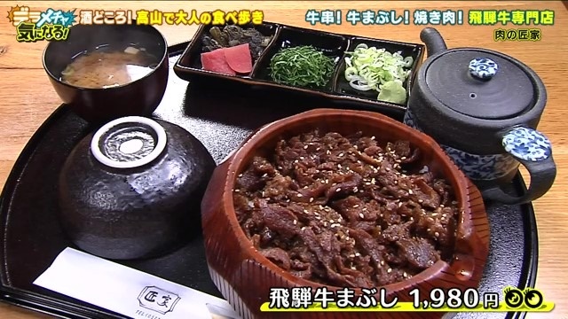 次に向かったのは、「肉の匠家 安川店」。リーズナブルに飛騨牛を楽しめる店で、1階にはテイクアウトの串焼き、まぶし専門コーナーと精肉店があり、2階にはこだわり焼肉コーナーがある、まさに肉のテーマパークだ。まぶしコーナーの人気メニューは飛騨牛の時雨煮がたっぷり乗った「飛騨牛まぶし」。