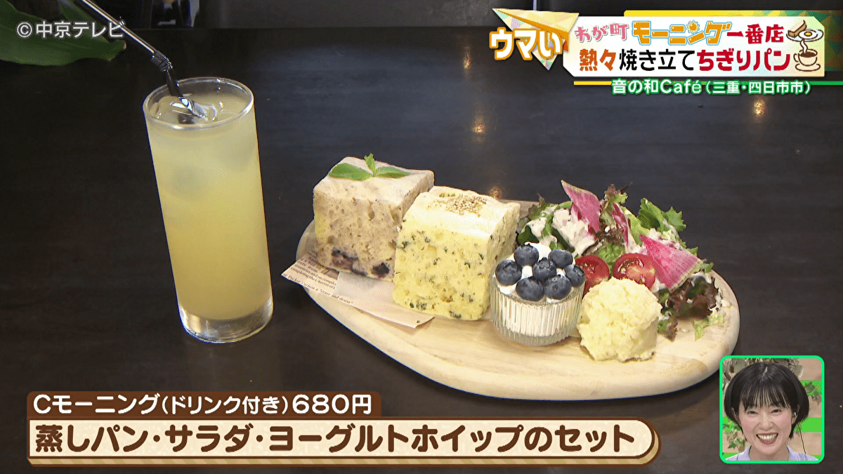 さらに注文したのは、蒸しパン・サラダ・ヨーグルトホイップにドリンクが付いたセットです。月によって味が変わる蒸しパンは、なんとも珍しい味で焼き上げられています。取材日の味は