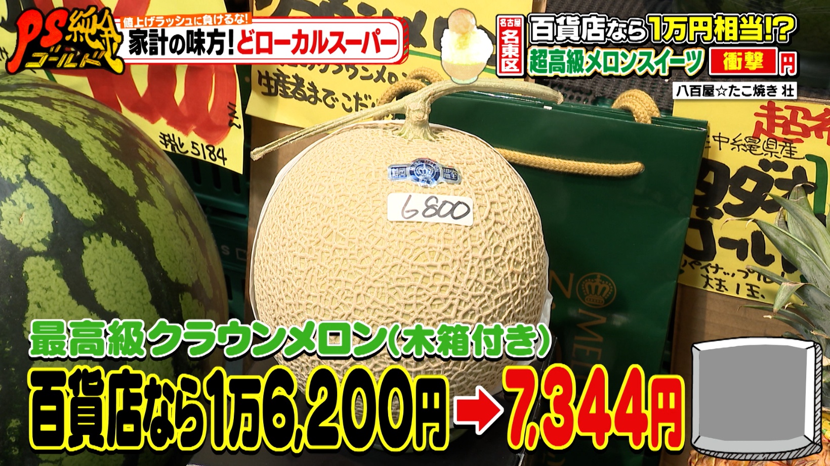 百貨店なら16,200円相当の最高級クラウンメロンを7,344円で販売。フルーツマイスターの愛称を持つ店主の壮さんは、高級フルーツを「百貨店の半額ぐらいで売っている」と話します。