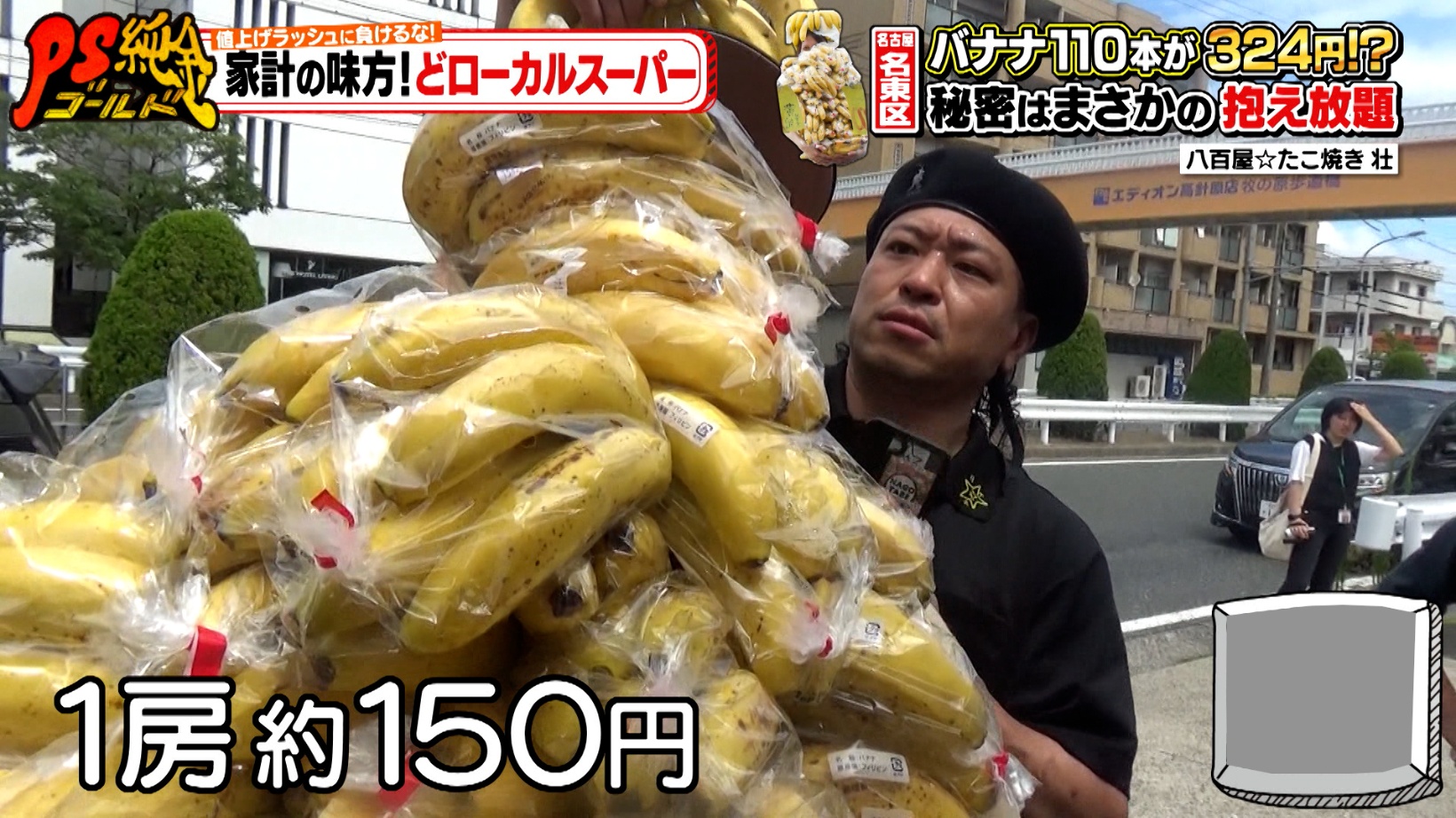 バナナの詰め放題ならぬ、「落とすまで抱え放題」を開催!こちらは1回324円でチャレンジでき、抱えきれず落とした分までお持ち帰りできるそうです。中には、110本以上のバナナを持ち帰るお客さんも。大赤字でも「お客さんに楽しんでもらうことが重要」という店主の想いに、藤森さんも「これは楽しいわ」と感心するのでした。