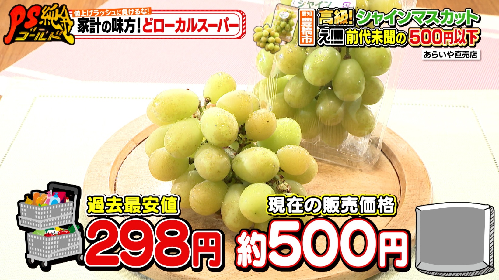 この季節におすすめのシャインマスカットは現在約500円。さらに、一番安いときで298円です!お盆需要の去った9月が、一番お値打ちになるのだとか。