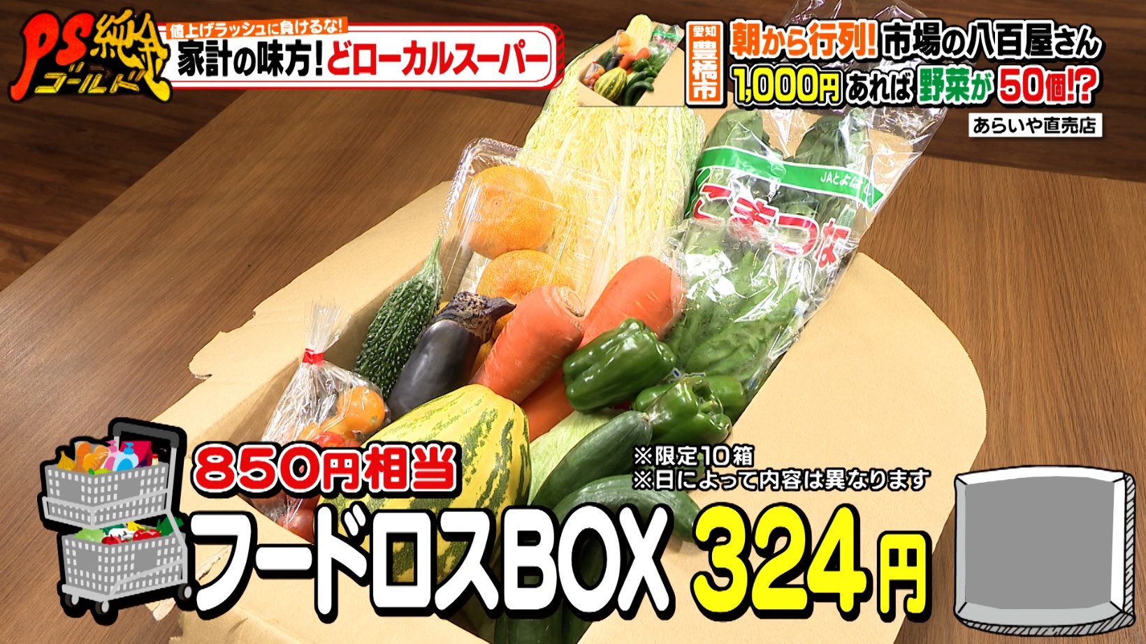 タイガーメロンや小松菜など12種類の野菜とフルーツが入った「フードロスBOX」。おいしい野菜を絶対にムダにしたくないという想いで、大手スーパーの規格外品を安く提供しています。1箱324円という衝撃価格に、高田さんも驚きを隠せない様子でした。