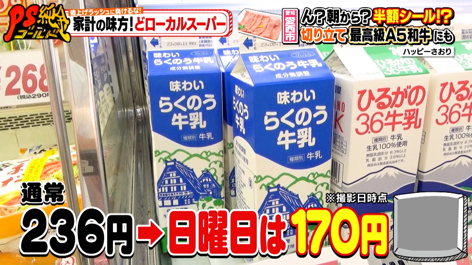 ここでは、通常236円の牛乳が日曜日は170円に!(※撮影日時点)なんと30分で800本が完売していました。
