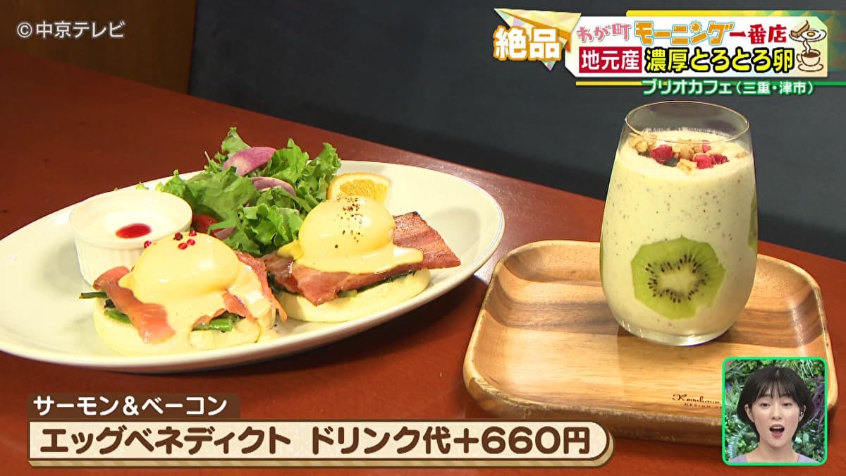 赤木アナは「エッグベネディクトモーニング」を注文しました。津市のタマゴを使用しており、トロトロの焼き加減で仕上げられています。サーモンとベーコンの2種がセットの豪華なモーニングですよ。