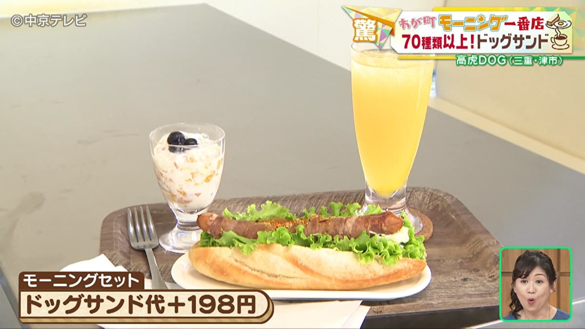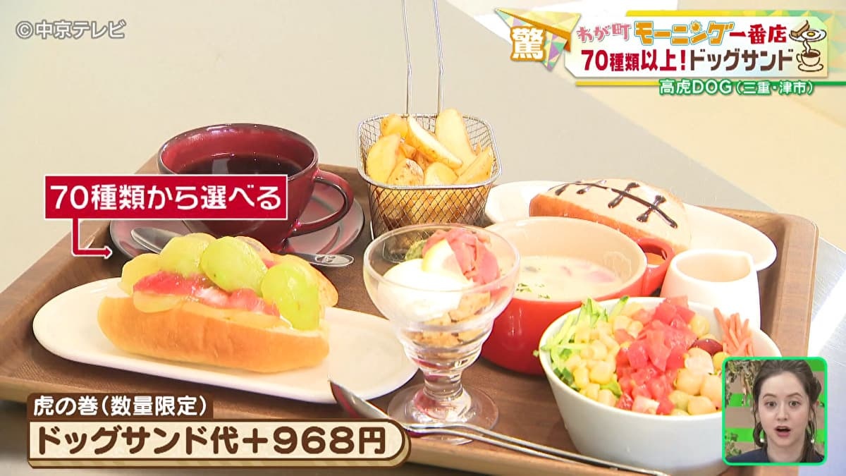 赤木アナは、数量限定の虎の巻セットを注文しました。70種類以上のドッグサンドからひとつを選べるセットで、前菜やスープ、サラダにフライドポテトまでついてきます。
