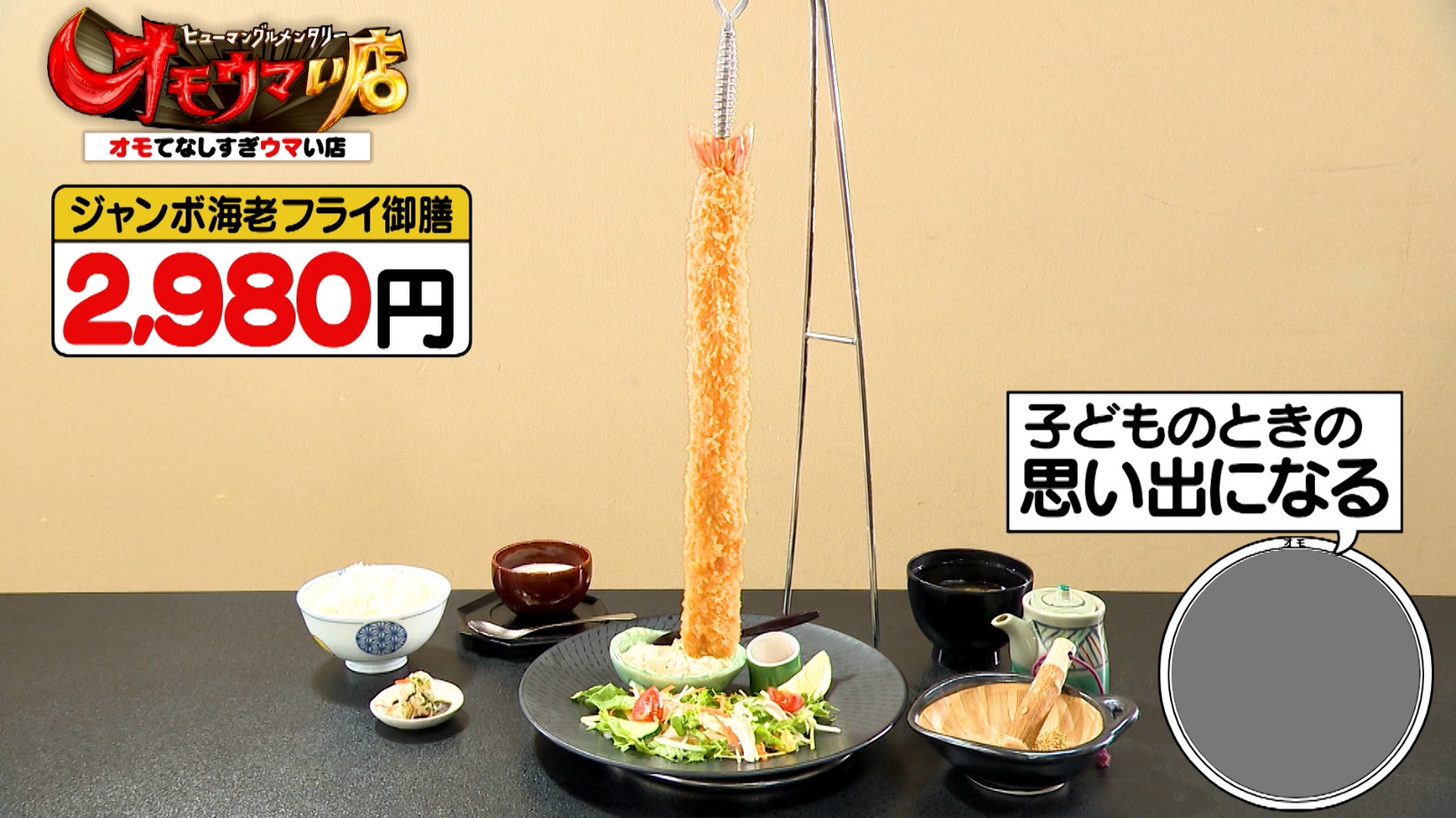 店の名物は、長さ36cmもある「ジャンボ海老フライ御膳(2,980円)」。ロングエビフライを金具に吊り下げて提供する光景に、乃木坂46の五百城茉央さんは「スゴイ!」と驚きます。