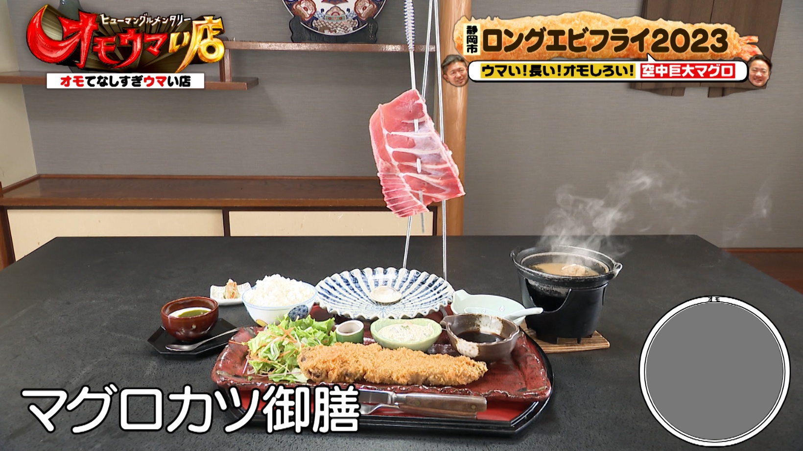 天然南マグロのすき身と長さ25cmのマグロカツが楽しめる「まぐろカマカツすき身吊るし御膳(2,980円)」は、漁船からマグロを降ろすときの、マグロを吊るしている様子をイメージしています。すり身をマグロカツの上にのせて、ワサビ醤油で食べるのがオススメですが、タルタルソースにも合うとのこと。社長と専務のタルタル愛に、スタジオは笑いに包まれるのでした。