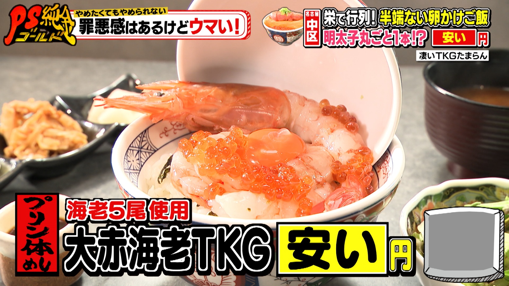 大赤エビを5尾も使用した「大赤海老TKG(1,800円)」。エビといくらが丼を埋め尽くしており、藤森さんは「海鮮丼?」と笑いを誘います。