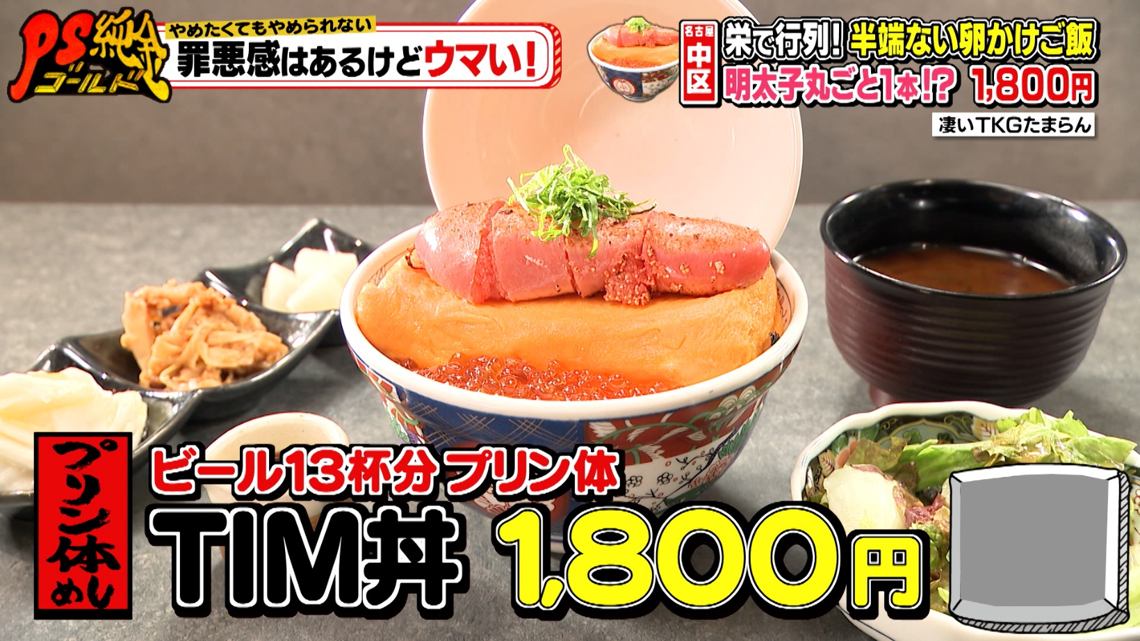 中でも痛風MAXの罪悪めしが、「TIM丼(1,800円)」。卵焼きと普通サイズの2.5本分の明太子、いくらが盛られた「TIM丼」を試食したかなでさんは、「美味しい!」と絶賛します。さらに、卵黄1個入りのたまごしょうゆをかけると美味しさがアップするそうです。