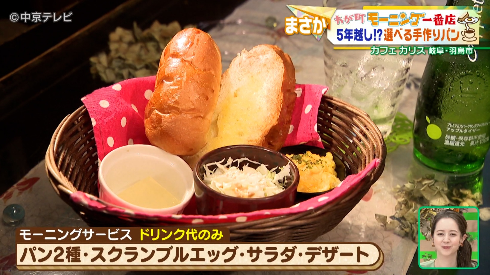 モーニングでは、手作りのパンやサラダ、デザートなどのセットをバスケットに入れて提供しています。