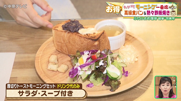 松原アナは、ドリンク代のみでいただけるトーストモーニングを注文しました。トーストとサラダ、スープが実質無料。ドリンク代のみで専門店の食パンをいただけるのはおトクですね。