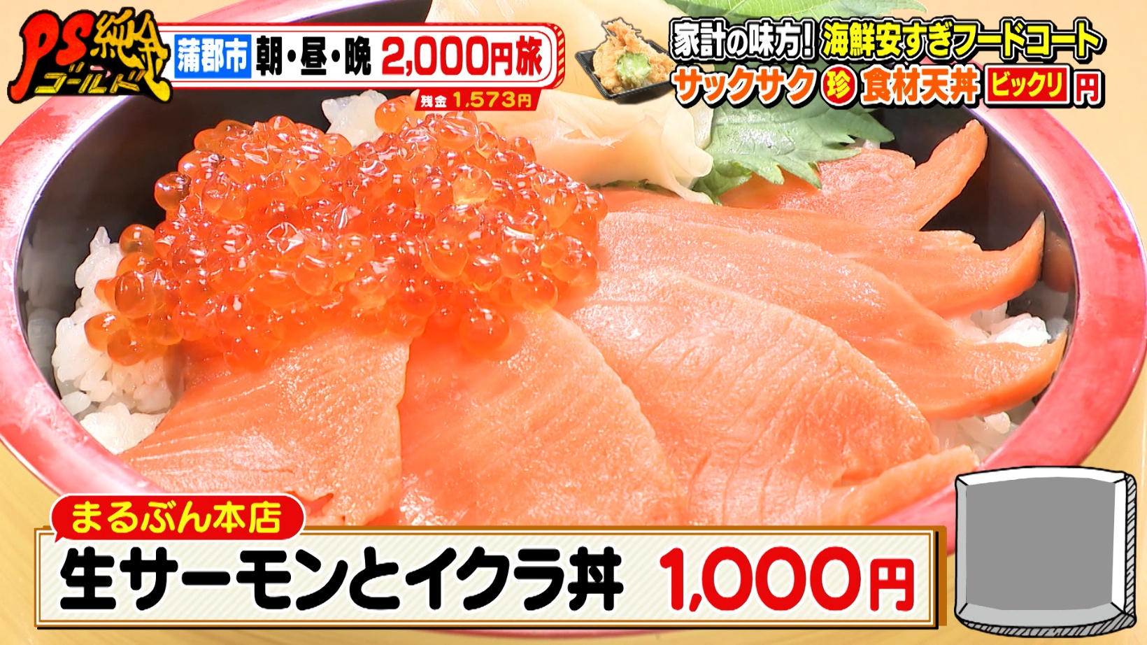 フードコート内の『まるぶん本店』は、「生サーモンとイクラ丼(1,000円)」など豪快な丼を提供しています。