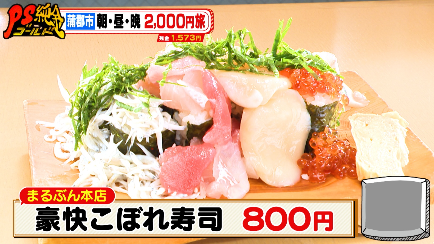 「豪快こぼれ寿司(800円)」はマグロ、ブリ、タイのブツ切り(日により異なります)、ホタテ、イクラがメニュー名の通り、こぼれんばかりにのせられています。