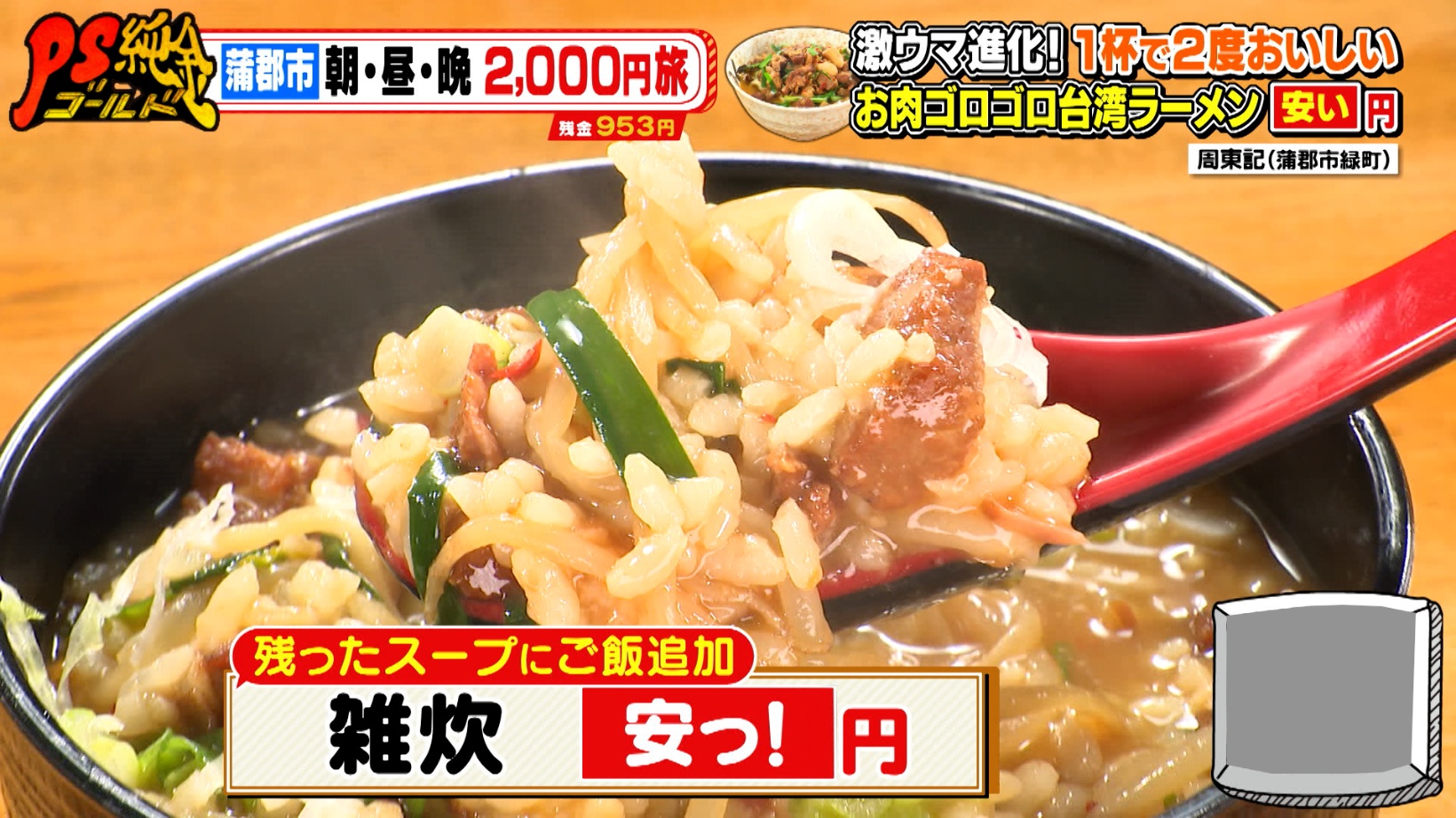 台湾ラーメンを食べ終わったあとにも、うれしいサービスが待っています。「ご飯(100円)」を追加すると、「台湾ラーメン」の残ったスープで雑炊が楽しめるそう。ゲストの比嘉愛未さんは、食欲をそそられる見た目に「おいしそう!食べたい」とコメントするのでした。