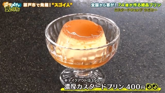 地元の方の声を元に二人が訪れたのは、カスタードショップ「ウオコー」。元は鮮魚店で、55年前からプリンを作るようになった。74歳のパティシエが作るこだわりのプリンは瀬戸市民のソウルフードとして有名で、今では全国からも絶品プリンを求めて客が集まっている。