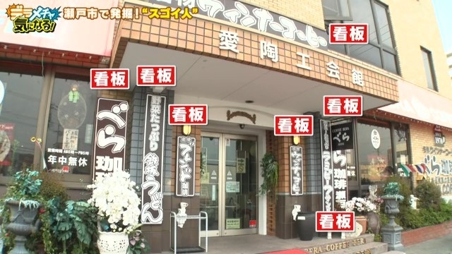 気になる喫茶店を見つけた二人。目を引いたのは、その看板の多さだ。創業50年の「べら珈琲 瀬戸店」は、店頭の看板が多いだけでなく、店内も社長の趣味であるアンティーク雑貨がずらりと並んでいる。