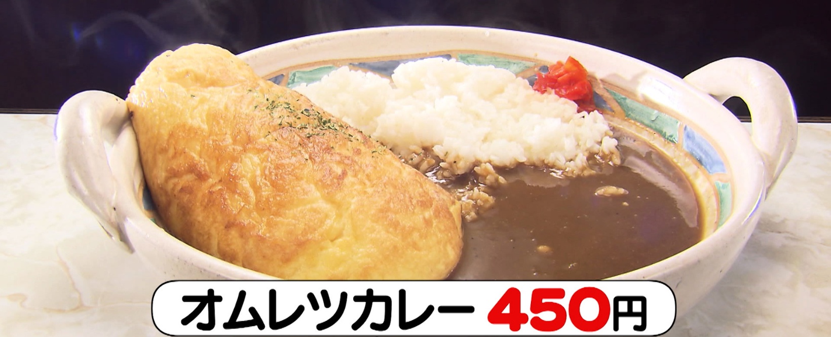 卵がぷよぷよと膨らんだオムレツを調理する様子に、スタジオから「プルプル」「生き物みたい」と声が上がります。自家製カレーの上にオムレツを乗せた「オムレツカレー」は、なんと450円!