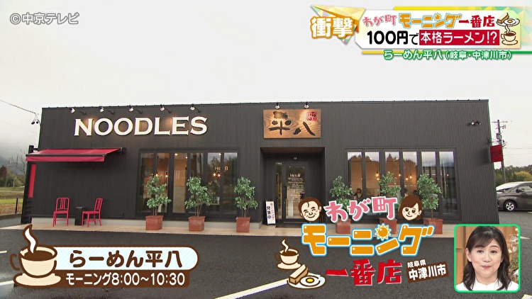「らーめん平八」は、モダンな外観がオシャレなラーメン屋です。モーニングでは、自慢のラーメンのほかパンやご飯のメニューも提供しています。