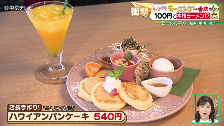 松原アナは、店長手づくりのハワイアンパンケーキを注文。パンケーキは小さめで食べやすいですが、3枚ついて満足感たっぷり。おかずとあわせて朝からペロリといただけますよ。