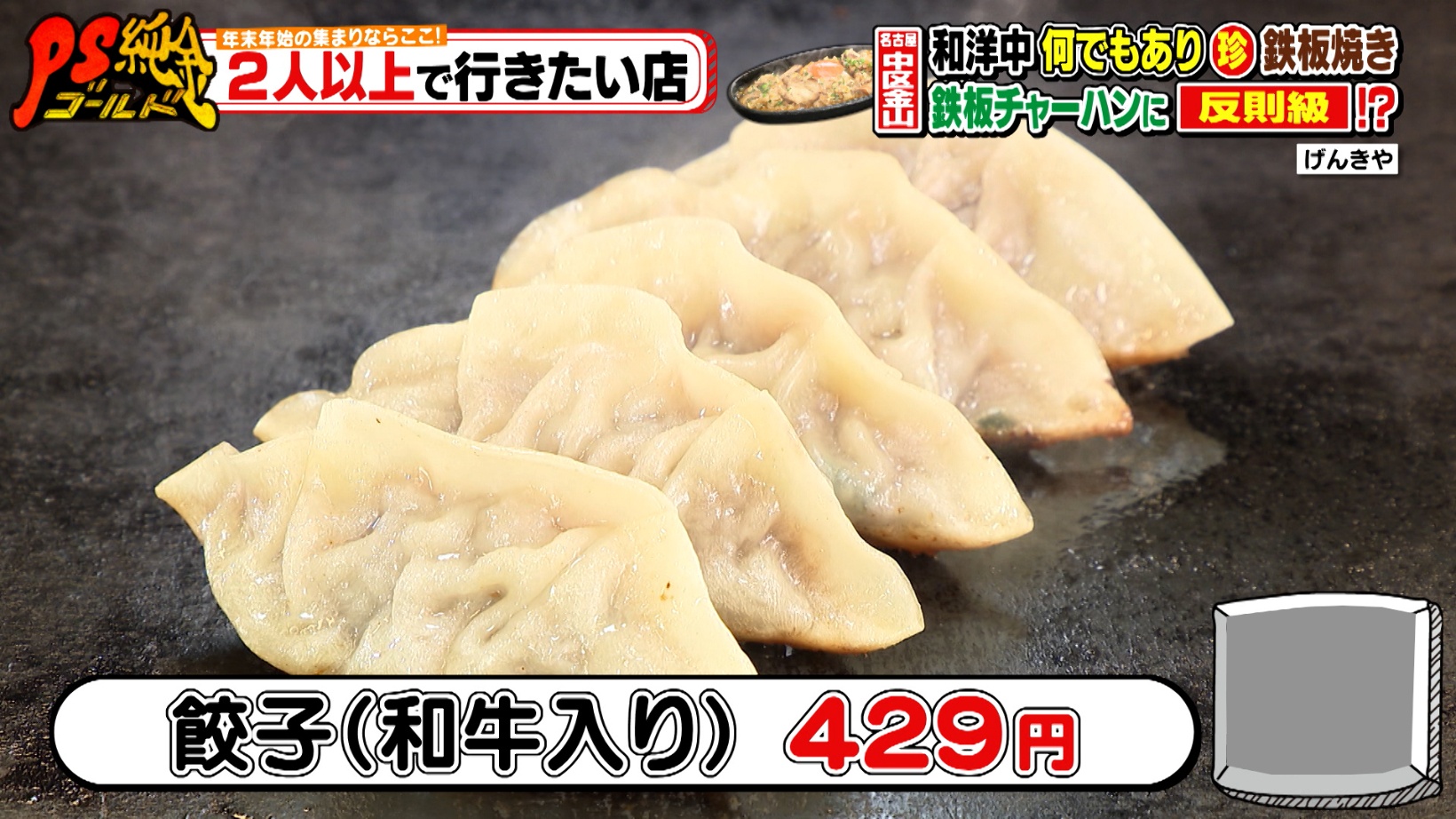 自家製の「餃子(和牛入り、429円)」も鉄板で焼き、アツアツでジューシーな一品です。