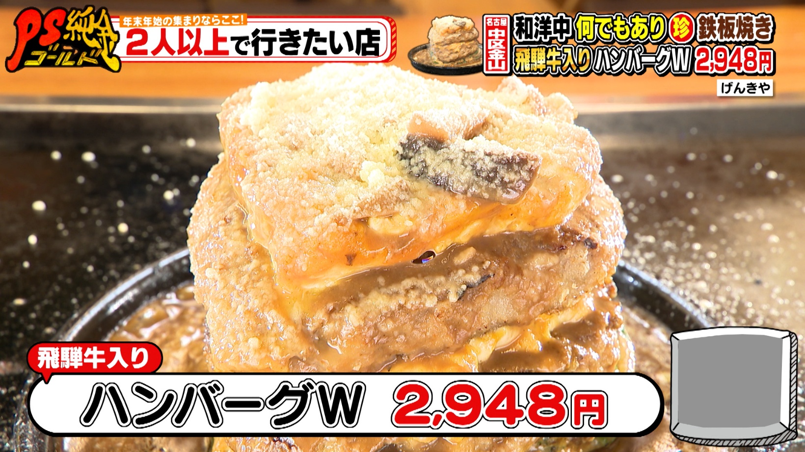 一方で、SNS映えするメニューがニラもやし卵&飛騨牛入りハンバーグ2枚の「ハンバーグW(2,948円)」。炎が上がる演出がインパクト抜群です。仕上げに、きのこ・大量のニンニク・赤ワインをじっくり煮込んだハンバーグソースと粉チーズをたっぷりかける様子に、スタジオから「これはスゴイね」と驚きの声が上がるのでした。