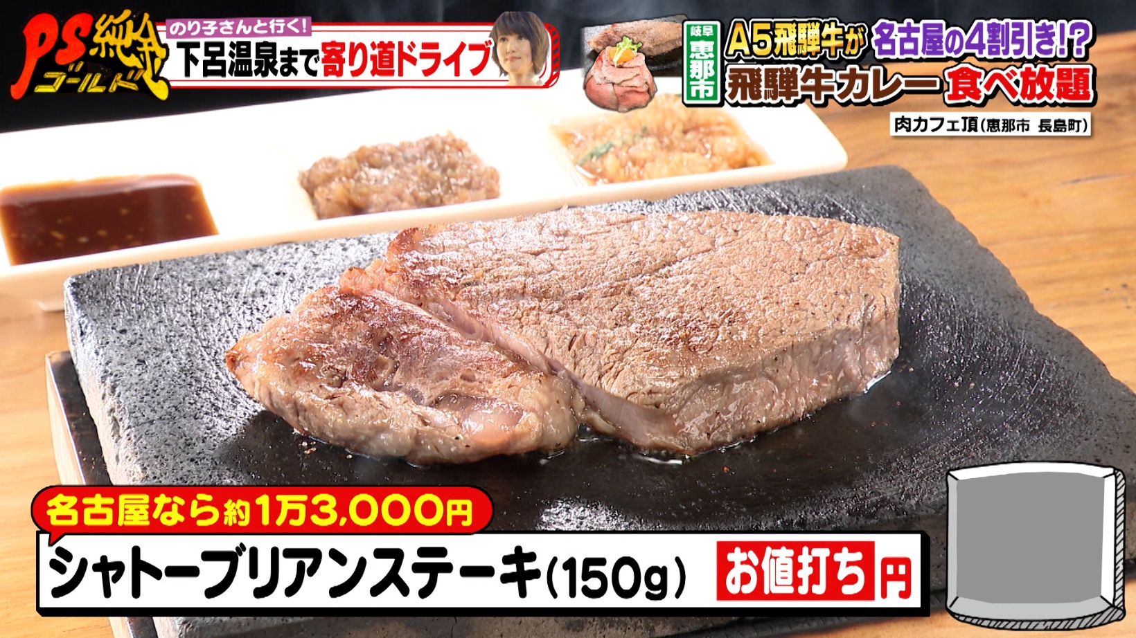 「シャトーブリアンステーキ(150g)」が登場すると、スタジオから驚きの声が上がります。最上級部位のシャトーブリアンなのに、4,928円という驚きの安さに、はるな愛さんは「うちの店では9,800円はします」と笑いを誘います。