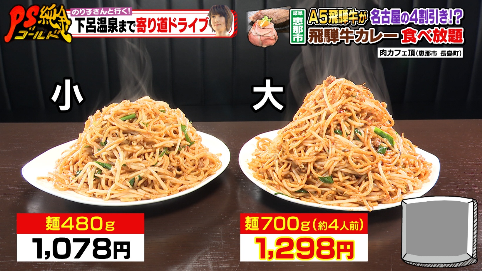 『肉カフェ頂』では、単品以外の料理を頼むとスープ・カレー・ライスが食べ放題になるそう。しかも、カレーはA5ランク飛騨牛ミンチ入りです。のり子さんと石橋さんは、「スタ麺×飛騨牛カレー」のアレンジメニューを堪能します。にぎやかにお喋りする石橋さんに対し、黙々と平らげるのり子さんなのでした。