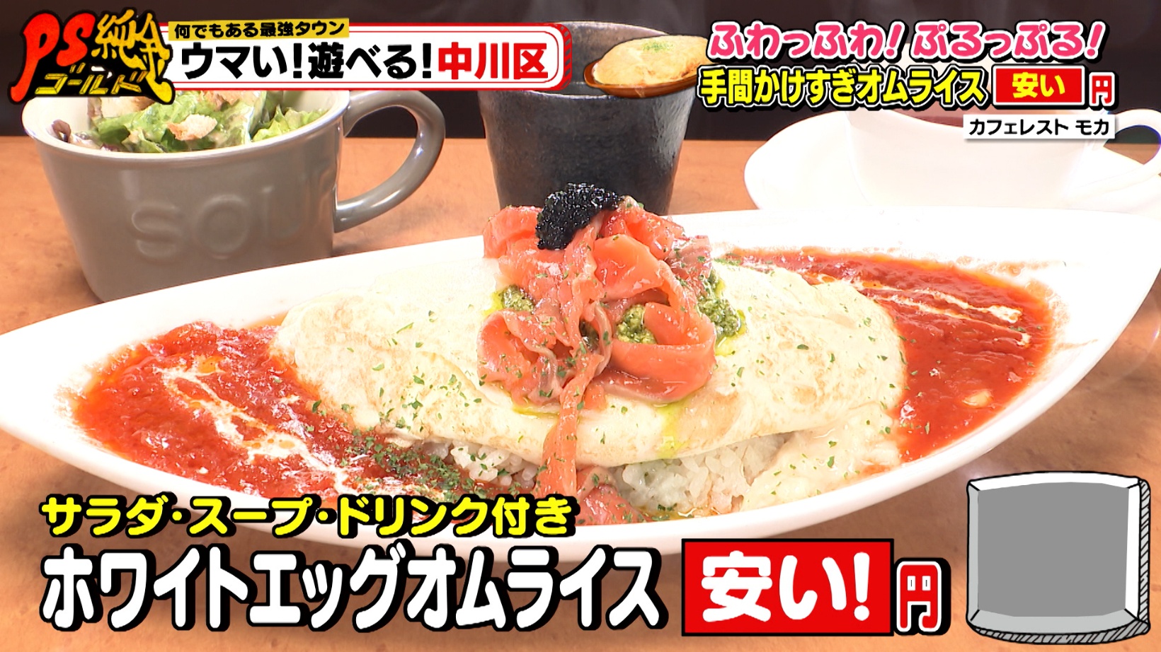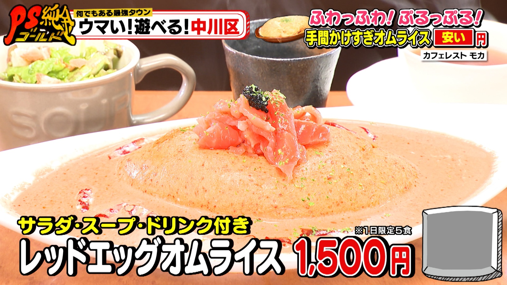 30種類以上あるオムライスの中でも、名古屋でココだけ?の激レアメニューが「ホワイトエッグオムライス(※1日限定5食)」。高級卵を3個使い、自家製トマトソースをかけサーモンマリネ&キャビアをトッピングした贅沢な一品。ゲストの伊武雅刀さんは「2,000円は超えるよね?」と予想しますが、そのお値段はサラダ・スープ・ドリンク付きでなんと1,500円です。