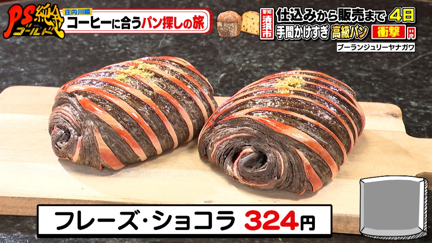 中に自家製のイチゴクリームが入った「フレーズ・ショコラ(324円)」に、ピスタチオが入った「ピスターシュショコラ(324円)」。こちらの店では、美しすぎるパンにひかれ爆買いするお客さんが続出します。