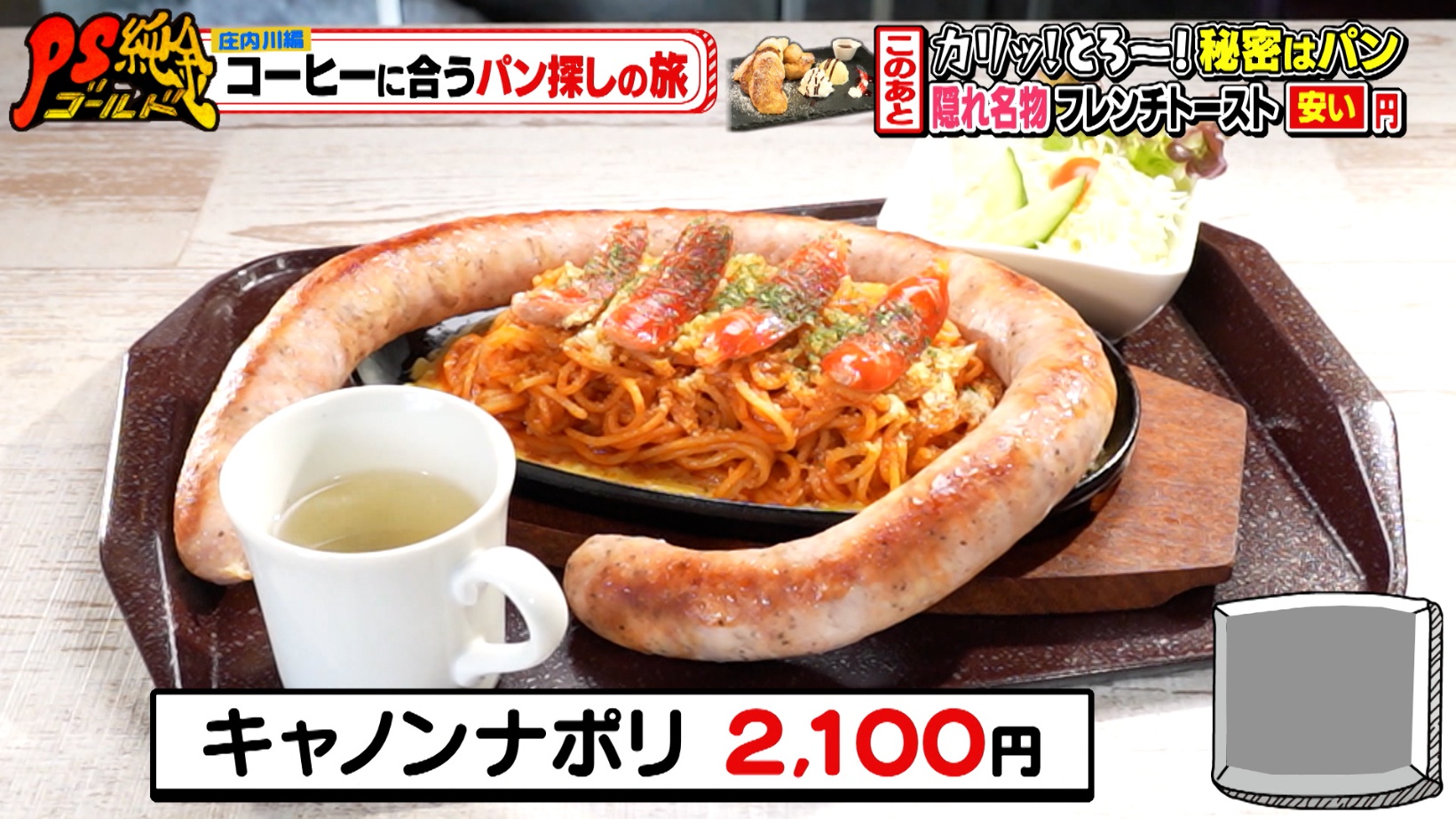 お客さんも驚きの「キャノンナポリ」は、鉄板ナポリタンの上に長さ50cm・重さ400gの巨大ソーセージが豪快にのっています。ソーセージは特別にオーダーしたもので1本2,000円相当ですが、「キャノンナポリ」の値段はなんと2,100円です。