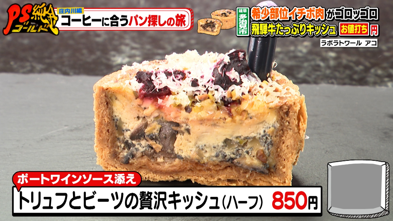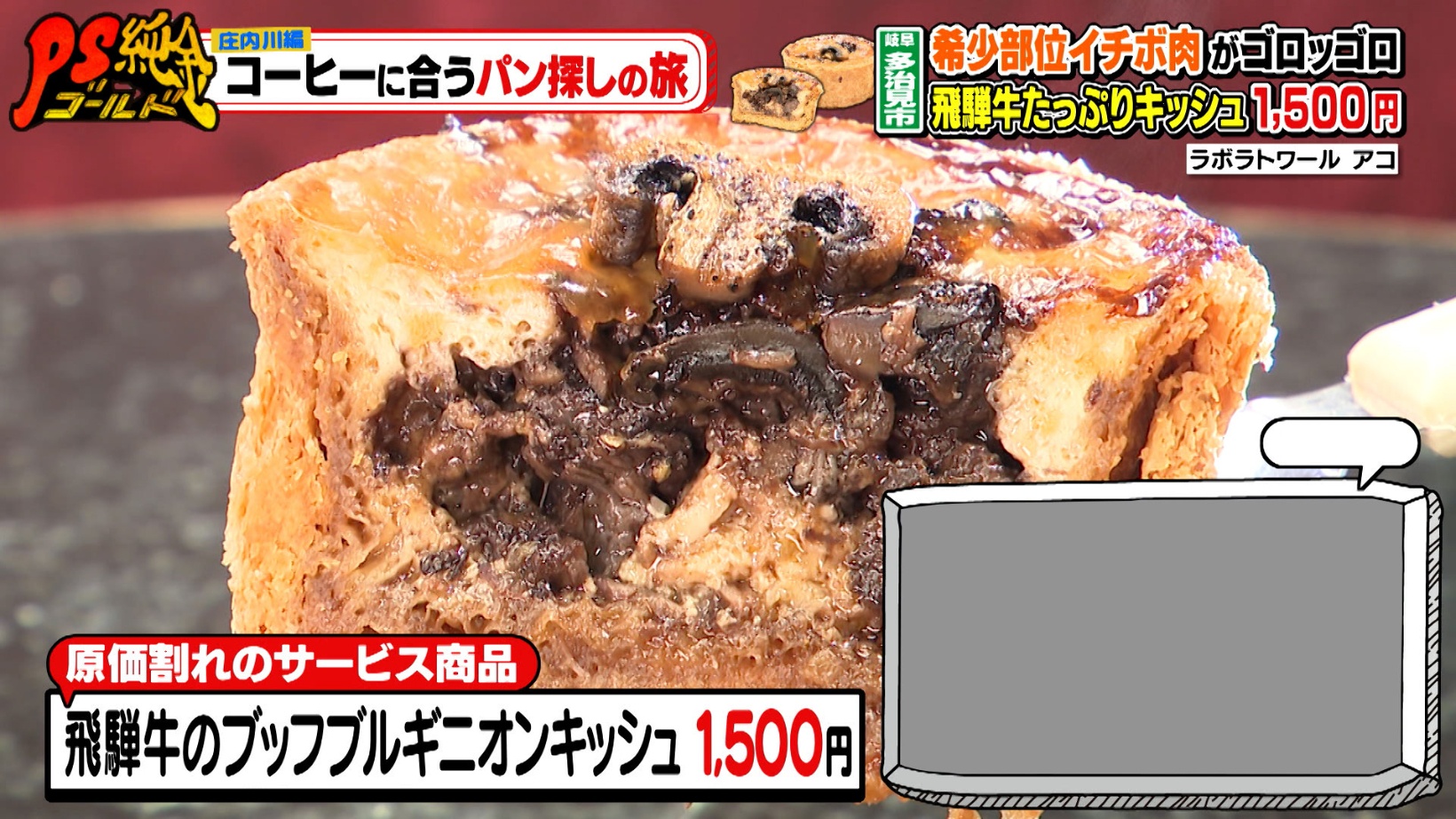 フレンチの技法を生かした「飛騨牛のブッフブルギニオンキッシュ(1,500円)」。牛1頭からわずか数%しかとれない、希少部位のイチボを使用した「牛肉の赤ワイン煮」がたっぷり入っています。スタジオで試食をした辻本さんは、「お肉がホロホロ」と初めて食べるキッシュに大興奮なのでした。