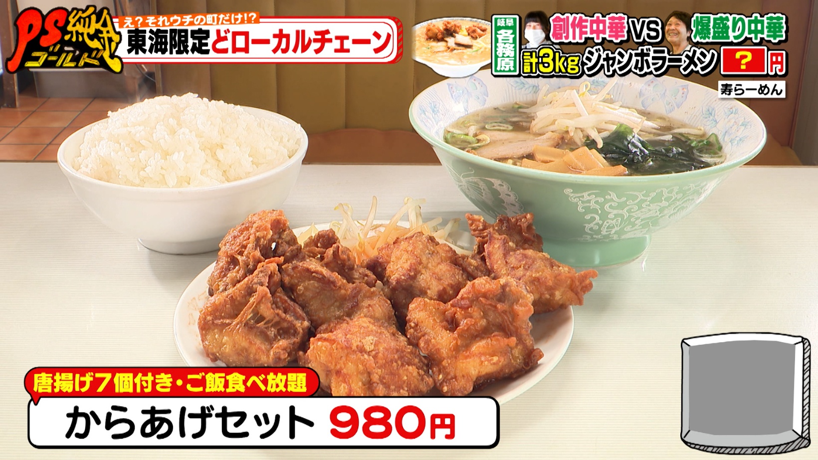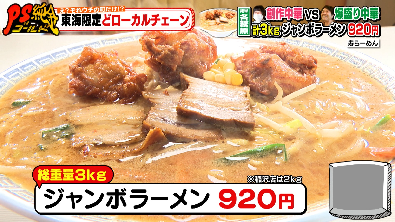 中でも圧倒されるのは、麺を3玉、大きな唐揚げを3個のせた総重量約3kgの「ジャンボラーメン」。スタジオでは1,000円超えを予想するも、920円という衝撃価格なのでした。