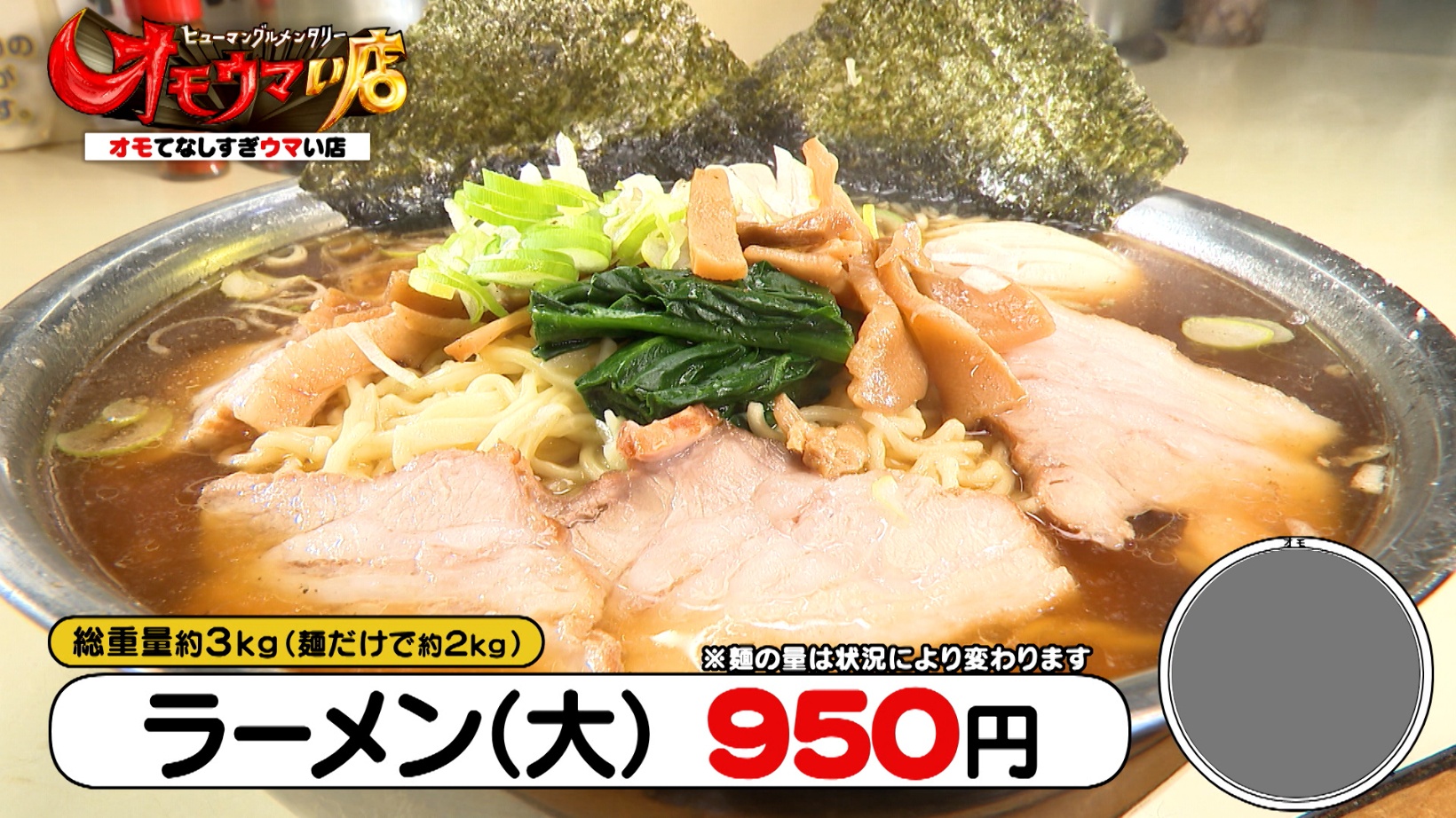 銀ボウルに入った「ラーメン(大・950円)」が運ばれると、スタジオから「器がボウル!?」と驚きの声が上がります。自家製中華麺が6玉も入り、総重量約3kgのとんでもないボリューム!普通盛りでも麺600g以上あり、男性のお客さんが2人でシェアすることも。