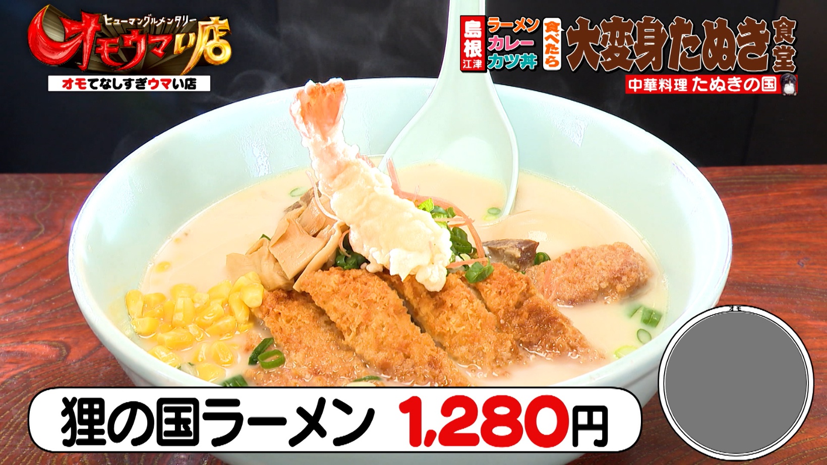 豚骨スープの「狸の国ラーメン(1,280円)」は、とんかつや自家製チャーシュー、コーン、えびの天ぷらなどがトッピングされています。珍しいトッピングに、JO1の川西拓実さんは「ラーメンに天ぷら?」とコメント。ほかにも、「豚丼(1,000円)※期間限定」や「カツカレー(大・1,700円)」など、どのメニューもボリューム満点です。