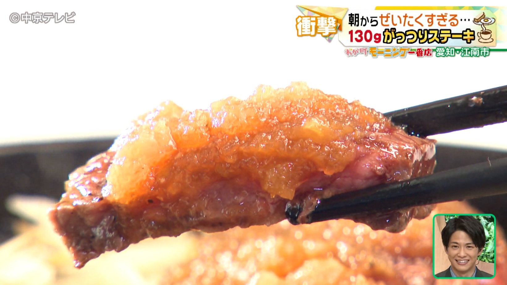 スギちゃんが注文したのは、お店一番人気のステーキモーニング!熱々の鉄板にタマネギのオリジナルソースをかけていただきます。柔らかくて食べやすく、年間3万食も注文されているそうですよ。