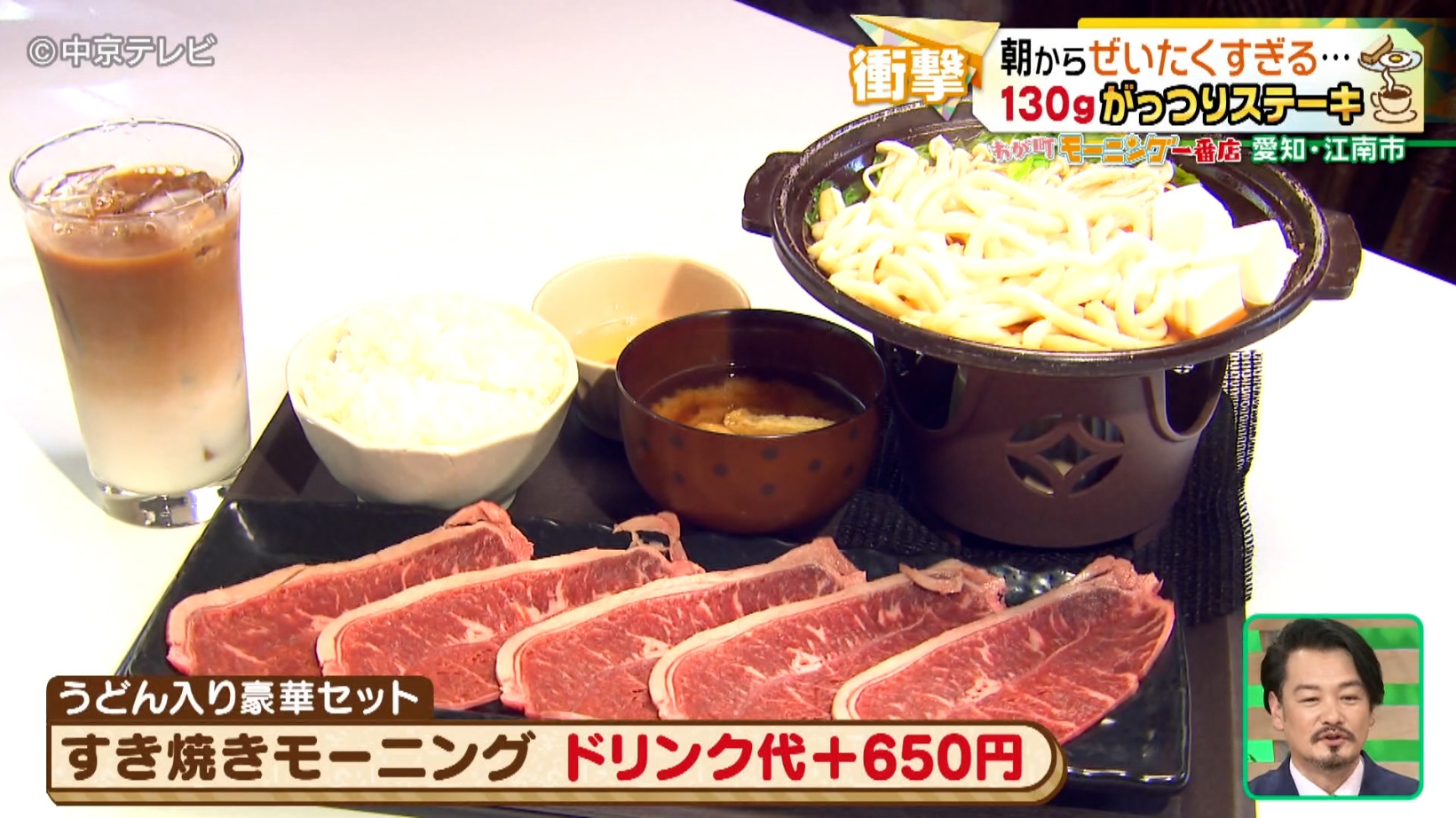 阿部アナはすき焼きモーニングを注文。お肉の脂が強くないので朝からペロリといただけます。うどんも入って大満足の一品です。