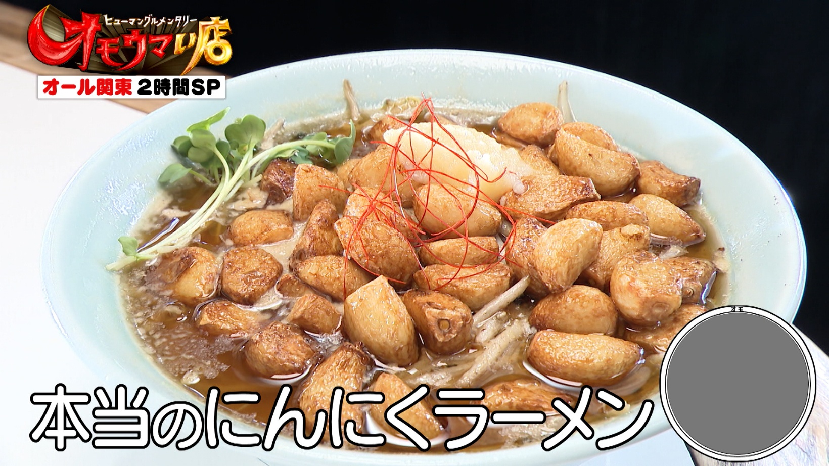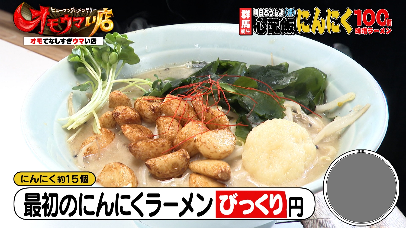 にんにく約15個入りの「最初のにんにくラーメン(1,000円)」。12年前にオープンした当初は、揚げニンニクの数は15個だったのだとか。番組スタッフが「何で増えたんですか?」と尋ねると、店主は「(器に入れるときに)俺が転んじゃった」と丼ぶりにたくさん入れてしまったのがきっかけだったと話します。