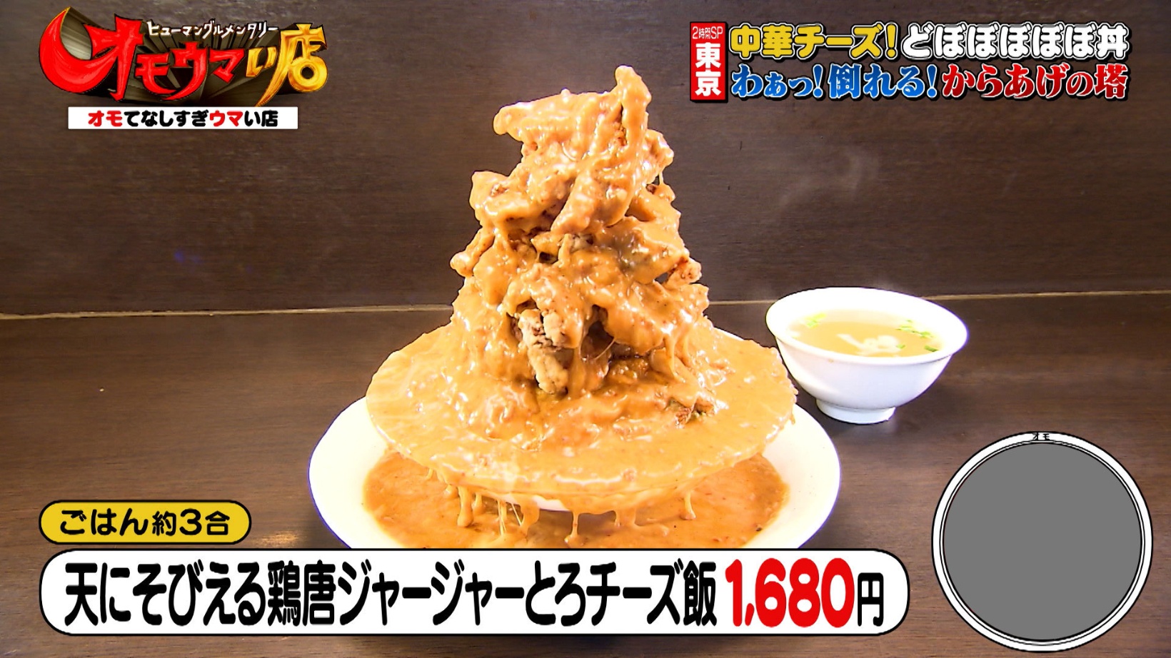 『麺飯店 俵飯』はデカ盛りの中華丼が人気の店。「天にそびえる鶏唐ジャージャーとろチーズ飯(1,680円)」が登場すると、スタジオから「スゴい!」と驚きの声が上がります。ごはん約3合の上に卵と唐揚げ6個がのせられ、器からあふれるほどの自家製ジャージャー(甘辛ひき肉あんかけ)とチーズを盛り付けたボリューム満点の一品です。