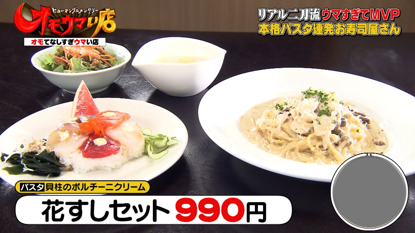 貝柱のポルチーニクリームパスタが付いた「花すしセット」は990円という安さ。値段を1,800円と予想したヒロミさんも信じられない様子です。