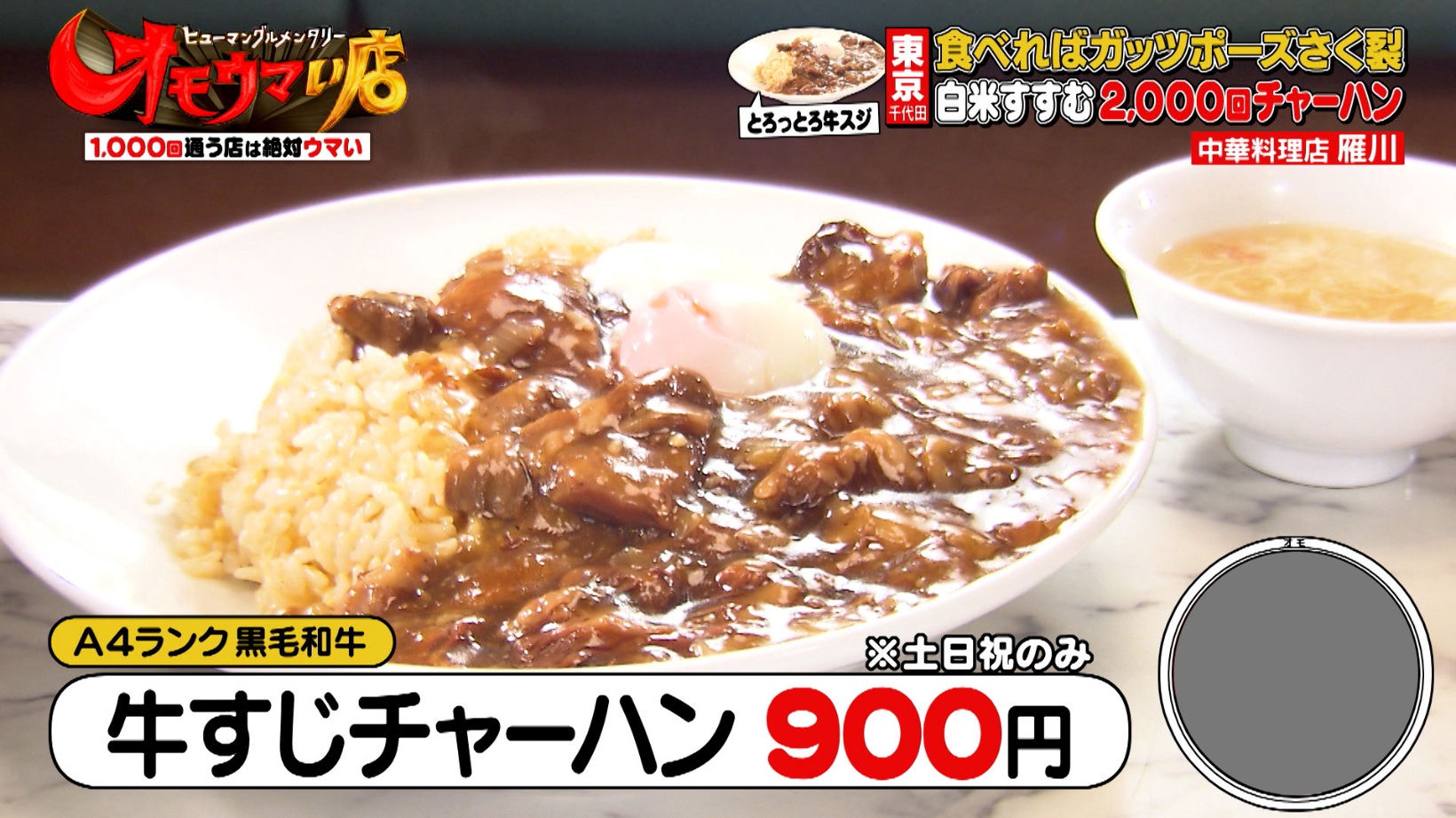 秋葉原駅近くにある『中華料理 雁川』は、常連客から「秋葉原で1番ウマい」「2,000回通った」という声が上がる人気店です。名物メニューは、A4ランクの黒毛和牛をトロトロに煮込んだ「牛すじチャーハン(土日祝のみ・900円)」。その美味しさは、初めて味わったお客さんが「こんなチャーハン食べたことない!」と思わずガッツポーズをしてしまうほど。