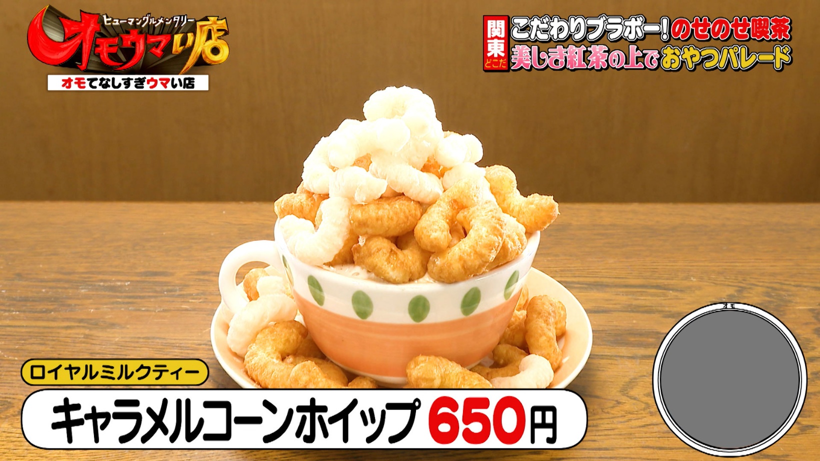 ロイヤルミルクティーの上にお菓子をたっぷりのせた「キャラメルコーンホイップ(650円)」。大胆に盛り付ける店主の様子に、ヒロミさんは「何であの積み方なの?」とツッコミを入れます。「円すいが大好き」と話す店主は、提供するメニューの見た目にこだわりがあるようです。