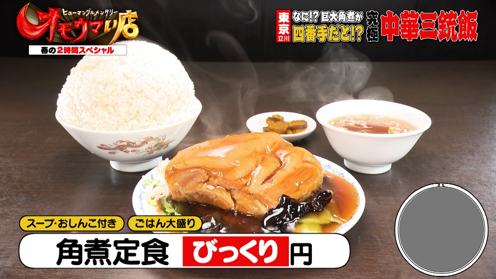 開店前からお店の前に行列を作る、東京都立川市の『四つ角飯店』。ジャイアント角煮がのった「角煮定食(ごはん大盛り・1,900円)」は、お肉がトロトロで箸で簡単に切れるほどやわらかい食感です。1個約600gの豚バラ肉を豚骨や豚足、煮干しなどと一緒に8時間ほど煮込み、しょうゆと肉の臭みを消す八角(木の果実)を投入してさらに1時間煮込んで仕上げます。